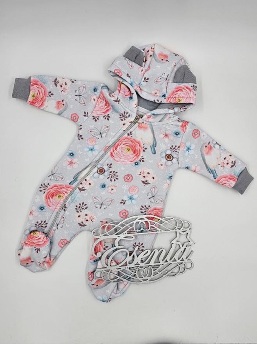 ESENIA Комбинезон с капюшоном для малышей с начесом Серо-голубой с цветочками