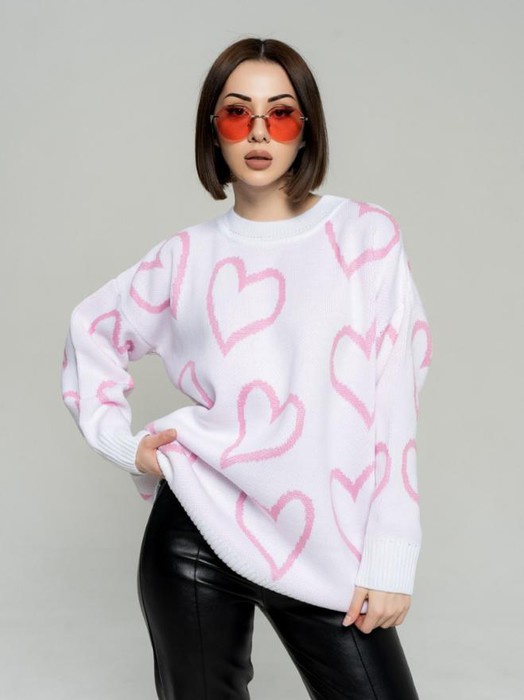 Совместные покупки Курган Женская одежда Джемперы, свитеры, водолазки — ESENIA Свитер молодежный полушерстяной - Розовые сердечки