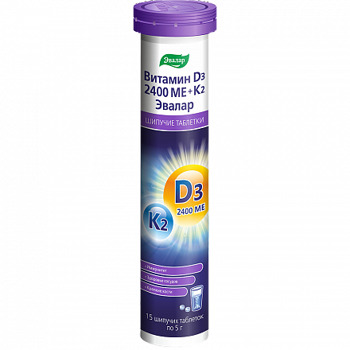 Витамин Д3 2400 МЕ + К2 в форме шипучих таблеток от компании "Эвалар" содержит популярный витамин D в высокой дозировке, усиленный натуральным витамином К2, который дополняет действие витамина D и помогает ему лучше усваиваться. **Витамин Д3 2400 МЕ + К2 способствует:** - укреплению иммунитета; - снижению риска развития простудных и вирусных заболеваний; - безопасному усвоению кальция, препятствуя отложению в сосудах, суставах и почках; - формированию и поддержанию плотной структуры костей; - повышению силы мышц.