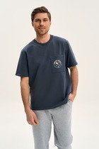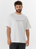 Фуфайка с коротким рукавом среднего объема, с оригинальным принтом, круглым вырезом горловины, которая оформлена обтачкой из рибаны.