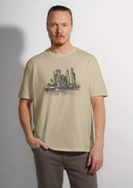 Фуфайка с коротким рукавом среднего объема, с оригинальным принтом, круглым вырезом горловины, которая оформлена обтачкой из рибаны.