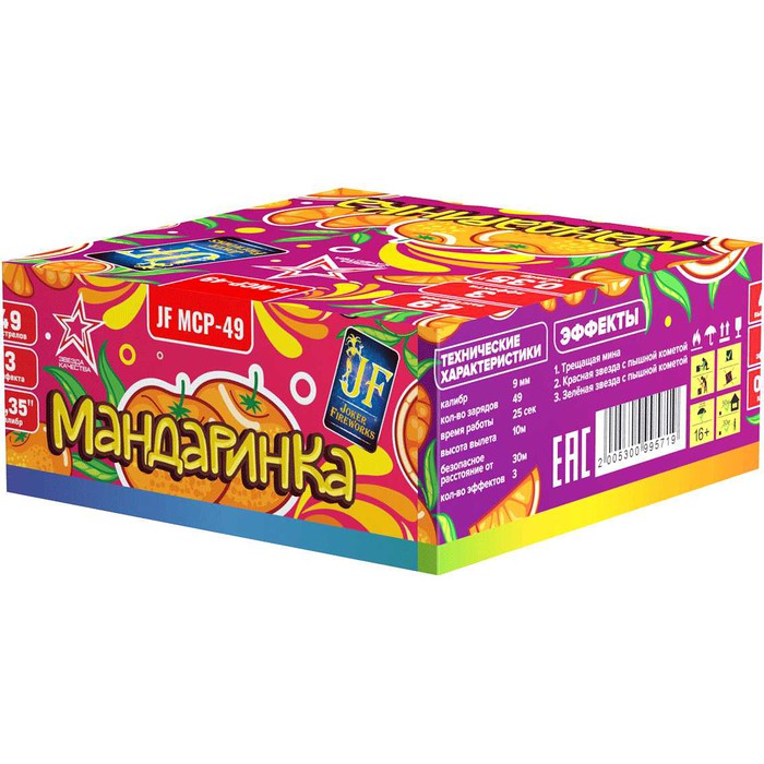 Если вы хотите приобрести на детское мероприятие недорогой салют, то смело берите фейерверк Мандаринка. В этом небольшом шоу вас порадует целых 49 залпов, взлетающих на высоту 10 метров! Они обладают красивыми эффектами: перед вами раскроются красные и зеленые звезды с пышной кометой. В дополнение к этому разлетятся россыпью трещащие звезды. Множество серебристых искр оставят сладкое мандариновое послевкусие праздника!Эффекты:1. Трещащая мина. 2. Красная звезда с пышной кометой. 3. Зелёная звезда с пышной кометой.