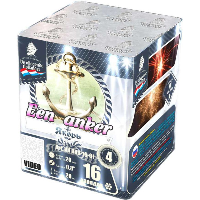 Описание:А не пора ли нам "стать на Якорь" и остановиться в одном из уютных милых портов гостеприимной Голландии и полюбоваться на множество красочных домиков, разбросанных по небу маленькими огоньками и собранными воедино на небесной карте, под шум прибоя из золотистых шумных веселых искр. Кажется, что маленькие золотые рыбки подымаются с самого дна в небо, чтобы поприветствовать своих гостей. Если забыть на минуту о том, что это шаловливые пиротехнические змейки, то их легко можно перепутать. Красочные отблески ночных огней портового города в мерцающих звездах салюта на фоне бескрайнего моря ночных небес приятно ослепляют и радуют своими красками. Кажется, что видишь в небе отражение небольшого, уютного и приветливого городка, благоухающего ароматами голландских тюльпанов.Эффекты:1. Красно-оранжевые звезды с белыми хвостами, белые мерцающие звезды. 2. Сферы мерцающих белых звезд. 3. Зеленые звезды с белыми хвостами, трещащие серебряные вспышки. 4. Мощный залп тысячи серебряных хризантем.