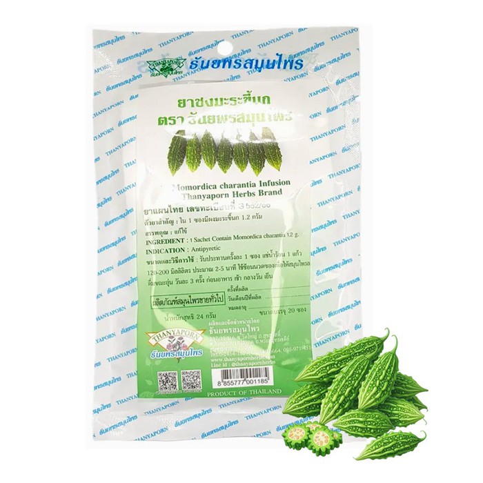 Натуральный травяной диабетический чай на основе растения момордика (горькая дыня или горький огурец) для снижения уровня сахара в крови, а также с противовоспалительным и общеукрепляющим действиями от Тайского производителя фитопрепаратов компании Thanyaporn Herbs.