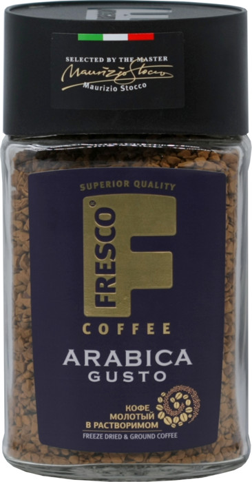 Натуральный растворимый кофе с добавлением натурального молотого кофе. Состав: 100% арабика (сорта Arabica Brazil Bourbon, Arabica Brazil Santos).Gusto создан по уникальной технологии производства растворимого кофе, при котором молотый жареный кофе становится неотъемлемой частью каждого кристалла сублимированного кофе. Насыщенный вкус и крепкий аромат — уникальные черты FRESCO Arabica Gusto.Крепость — 8, аромат — 9, плотность — 8.