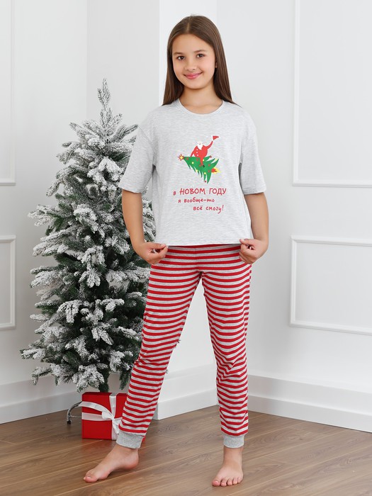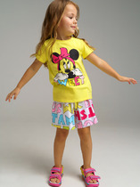 Футболка детская из гладкокрашеного трикотажного полотна "кулирка", модного силуэта, слегка укороченная, свободного покроя, с приспущенным плечом, втачными рукавами длиной до локтя, горловиной овальной формы, обработанной втачной планкой и принтом в центре переда. По шву втачивания планки настрочена отделочная строчка. Низ изделия и нижние срезы рукавов обработаны швом вподгибку.