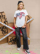 Футболка для мальчика из трикотажного полотна "кулирка" с приспущенным плечом, втачными короткими рукавами, горловиной овальной формы, обработанной втачной планкой и принтом на полочке, выполненным в технике шелкографии. По шву втачивания планки в горловину настрочена отделочная строчка.