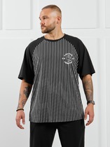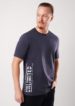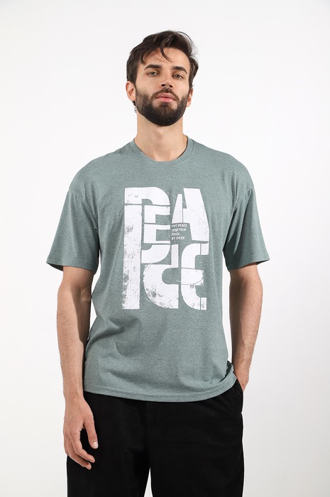 Футболка мужская из меланжированного трикотажного полотна "кулирка", свободного покроя, со спущенным плечом и втачными короткими рукавами. Горловина овальной формы обработана втачной планкой. По шву втачивания планки настрочена двойная отделочная строчка. В центре переда - принт, выплненный в технике шелкографии.
