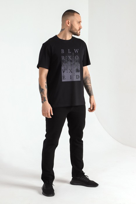 Футболка мужская из гладкокрашеного трикотажного полотна "кулирка" с лайкрой, классическогоь покроя, с коротким втачными рукавами, горловиной овальной формы, обработанной втачной планкой и принтом на полочке, выполненным в технике шелкографии.