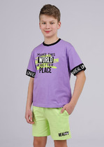 Яркая трикотажная футболка с блестящим принтом на груди и декоративными оборками по бокам. Прямой крой, круглый вырез горловины.На ребенке представлен размер 110:- Ширина изделия по линии груди 36,5 см- Ширина по низу изделия 34,5 см- Длина изделия 39,5 смРазница между размерами составляет 1,5 см.