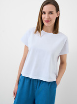 Футболка прямого свободного кроя, выполнена из хлопкового полотна. Характеристики: прямой свободный крой, горловина овальная, рукав слегка спущен, горловина и край рукава выполнены из довяза, по передней части изделия слева декоративная объемная печать "Annete". Длина по центру спинки 69 см, длина рукава 18 см.