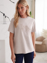 Футболка прямого свободного кроя, выполнена из трикотажного полотна молочного цвета. Характеристика: прямой крой, овальная горловина. Рукав спущен. Спинка цельнокраеная, по переду напечатан принт. Длина спинки 68см, длина рукава от края горловины 41см.
