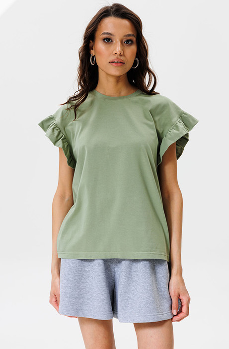 В этой футболке с воланами от GOwear вы не останетесь незамеченной! Вы легко сможете собрать много стильных образов с вашими юбками, шортами, жакетами и брюками!