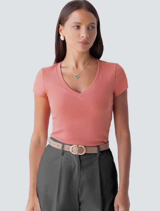 Состав: 95%Хлопок 5%ПУ Плотность: 210 Г/м2Облегающая футболка с V-образным вырезом террактового цвета создаст утонченный образ. Идеальная базовая модель для вашего гардероба! Глубокий V-образный вырез подчеркивает линию шеи и зрительно удлиняет силуэт. Футболка выполнена из хлопка с добавлением эластана, которая мягко облегает контуры тела, подчеркивая достоинства фигуры. Универсальный вариант для создания стильных повседневных образов.