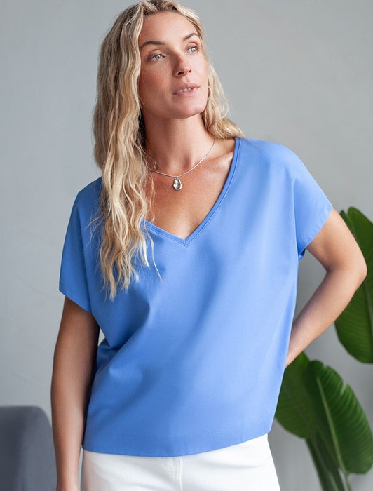 Состав: 92%Хлопок 8%ПУ Плотность: 170 Г/м2 Параметры модели на первом фото: Рост 170, бюст 89, талия 63, бедра 92Футболка с цельнокроеным рукавом выполнена из премиального хлопка. Базовая однотонная модель идеально впишется в любой гардероб. V-вырез подчеркивает ключицы и удлиняет шею, хорошо сочетается с жакетами или кардиганами. Изделие дополнено металлическим логотипом бренда.