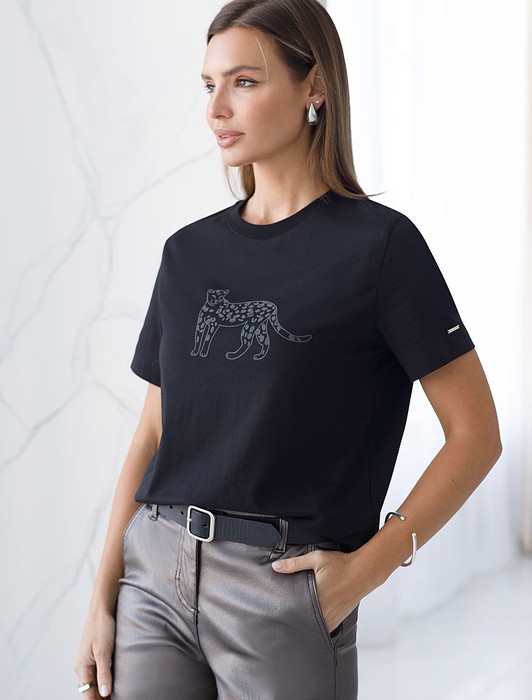 Состав: 92%Хлопок 8%ПУ Плотность: 170 Г/м2Футболка выполнена из премиального хлопка.Принт "леопард" нанесен фактурными красками с устойчивым покрытием. Наличие эластана в составе гарантирует комфорт и формоустойчивость. Изделие дополнено фирменным металлическим логотипом бренда.