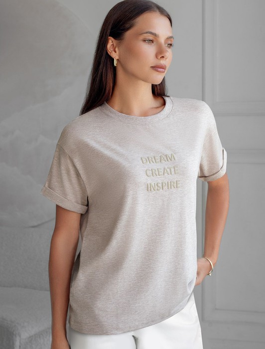 Состав: 92%Хлопок 8%ПУ Плотность: 170 Г/м2Перевод принта: Dream, create, inspire — мечтай, создавай, вдохновляй