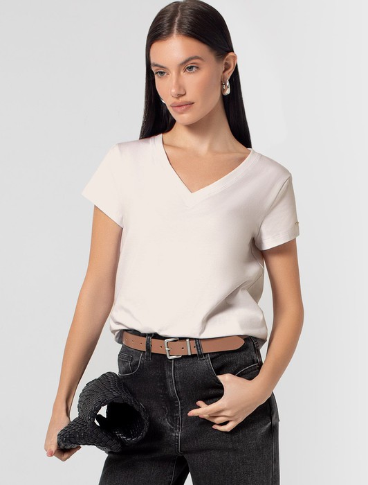 Состав: 92%Хлопок 8%ПУ Плотность: 170 Г/м2 Параметры модели на первом фото: Рост 172, бюст 88, талия 64, бедра 88Однотонная футболка с V-образным вырезом выполнена из премиального хлопка. Добавление эластана в состав изделия способствует формоустойчивости. Самое высокое качество длинноволокнистых хлопковых волокон обеспечивает комфорт в любое время года. Совет стилиста: очищенная от декора базовая модель будет уместна не только в повседневном образе с денимом, но и в офисе с нестрогим дресс-кодом, в паре с брюками и жакетом.