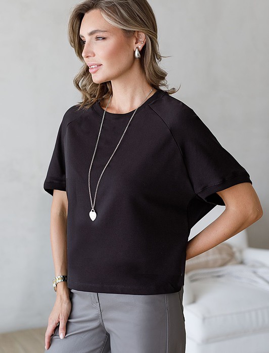Состав: 95%Хлопок 5%ПУ Параметры модели на первом фото: Рост 172, бюст 88, талия 64, бедра 88Футболка с рукавами регланами выполнена из эластичного футера двухнитки. Свободная модель со спущенной линией плеча легко поможет составить образы в расслабленном стиле. Сочетается в костюме с брюками D44.135, D44.136 и юбкой D46.034. Наличие эластана в составе изделия гарантирует абсолютный комфорт и формоустойчивость.