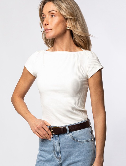 Состав: 95%Хлопок 5%ПУ Параметры модели на первом фото: Рост 172, бюст 88, талия 64, бедра 88Футболка выполнена из фактурного трикотажа в широкий рубчик. Модель с трендовым коротким рукавом и горловиной формы лодочка. Эластичный материал безупречно сидит по фигуре не сковывая движений. Впишется в любой гардероб. Изделие дополнено металлическим логотипом бренда.