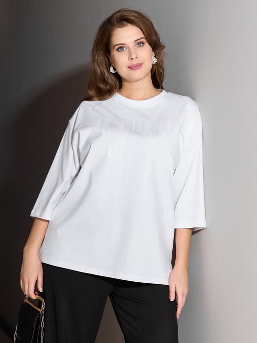 Футболка женская из гладкокрашенного трикотажного полотна «кулирка с лайкрой», свободного покроя, со спущенным плечом и втачными рукавами длиной до локтя, горловиной овальной формы, обработанной втачной планкой. По центру полочки выполнена вышивка «пайетками» в тон изделия. В нижней части боковых швов небольшие разрезы.