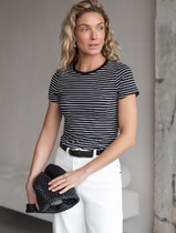 Футболка женская из г/к вискозного полотна со спущенным плечом. Проймы обработаны узкой притачной планкой, горловина - узкой бейкой из основной ткани.