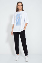 Футболка оверсайз выполнена из плотного хлопкового трикотажного полотна (интерлок). Втачной короткий рукав. Горловина круглая с притачной планкой. Ассиметричный низ футболки ( спереди немного короче ,чем сзади). Дизайнерский принт на передней половинке футболки и авторский флажок.