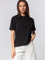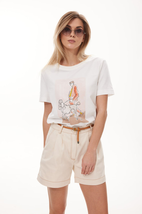 Стильная молодёжная футболка в стиле Casual, из хлопкового трикотажного полотна. Модель свободной формы с коротким рукавом. Горловина оформлена полосатой тесьмой-довязом. Перед модели декорирован стильной дизайнерской печатью.