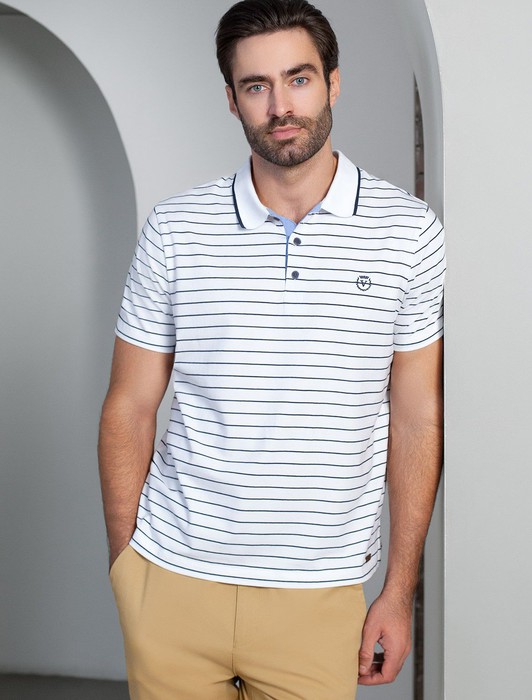 Состав: 92%Хлопок 8%ПУ Плотность: 170 Г/м2 Параметры модели на первом фото: Рост 190, бюст 108, талия 87, бедра 104Стильная футболка поло белого цвета в синюю полоску выполнена из гладкого премиального хлопка плотностью 170 Г/м2. Классическая футболка с отложным воротником на пуговицах поможет создать эффектный отбраз. Эластичная футболка подойдет на разные комплекции фигуры, в том числе большие размеры, включая 58. Мягкая и дышащая ткань обеспечивает комфорт в течение всего дня и поддерживет оптимальную воздухопроницаемость. Повседневная футболка подходит для любых ситуаций — от деловых встреч до повседневных прогулок. Такая вещь станет универсальным решением для тех, кто ценит удобство и элегантность в одежде.
