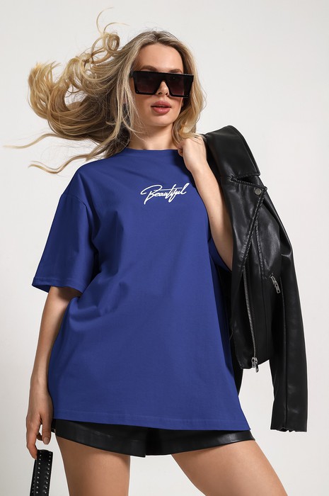 Футболка молодежная из гладкокрашенного полотна «кулирка» свободного покроя, со спущенной линией плеча, широкой подгибкой низа изделия и рукавов, горловиной овальной формы, обработанной втачной планкой, принтом на полочке, выполненным в технике «шелкографии».
