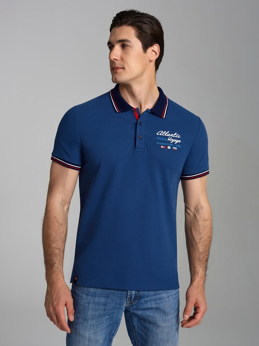 Футболка-поло из хлопкового полотна "пике". Классическая модель поло с короткими рукавами. Воротник и манжеты рукава выполнены из трикотажной рибаны темно-синего цвета с красно-белой полосой. На полочке застежка-планка на пуговицах. На нижней планке и по горловине настрочена контрастная киперная тесьма. На полочке вышивка "Atlantic Sailing Voyage" и флаги. По низу футболки в боковых швах выполнены разрезы, обработанные тесьмой. С правой стороны полочки, по низу настрочен жаккардовый "флажок" с логотипом.