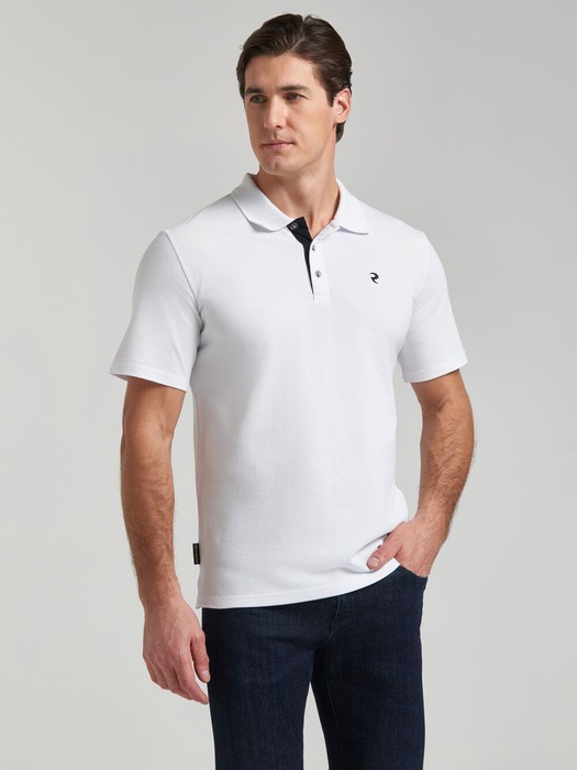 Футболка-поло из хлопкового полотна "пике". Классическая модель поло с короткими рукавами. Воротник и манжеты рукава выполнены из трикотажной рибаны темно-синего цвета с белой полосой. На полочке застежка-планка на пуговицах. На полочке вышивка "R". По низу футболки в боковых швах выполнены разрезы, обработанные тесьмой.