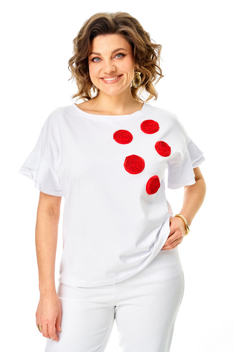 Джемпер женский из трикотажной ткани, полуприлегающего силуэта. По переду джемпера расположены декоративные элементы. Вырез горловины круглый, оформлен бейкой. Пройма рукава оформлена воланами.