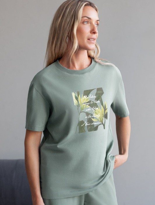 Особое внимание привлекает стильный принт в виде листьев и цветов с надписью, выполненный красками с устойчивым покрытием, который добавляет изделию оригинальности и позволяет выразить индивидуальность. Перевод надписи: The future belongs to those who believe in the beauty of their dreams - Будущее принадлежит тем, кто верит в красоту своей мечты.