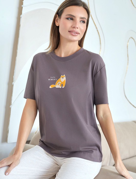Состав: 100%Хлопок Плотность: 140 Г/м2Футболка кофейного цвета выполнена из премиального 100% хлопка плотностью 140 Г/м2. Главная особенность этого изделия — тонкое кулирное полотно, которое легче и воздушнее стандартного варианта. Благодаря своей деликатной текстуре футболка идеально подходит для домашних образов и пижамных комплектов. Ткань отлично дышит, обеспечивая максимальный уют во время сна и отдыха. Особое внимание привлекает стильный принт контрастного цвета в виде котиков с надписью. Перевод надписи: Love moments - Моменты любви. Принт выполнен красками с устойчивым покрытием, который добавляет изделию оригинальности и позволяет выразить индивидуальность. Свободный крой футболки дарит удобство и не стесняет движений, что делает ее идеальной для повседневной носки или активного отдыха, подчеркивает современный взгляд на моду. Подойдет девушкам и женщинам на любую фигуру, вы будете чувствовать себя в ней уверенно и комфортно. Лаконичный современный принт делает изделие универсальным: можно создавать стильные образы для прогулок, встреч, занятий спортом и домашних дел. Базовая футболка подходит для любой ситуации и сочетается с разными элементами гардероба.