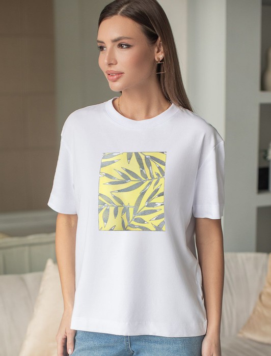 Состав: 100%Хлопок Плотность: 140 Г/м2Футболка белого цвета выполнена из премиального 100% хлопка плотностью 140 Г/м2. Главная особенность этого изделия — тонкое кулирное полотно, которое легче и воздушнее стандартного варианта. Благодаря своей деликатной текстуре футболка идеально подходит для домашних образов и пижамных комплектов. Ткань отлично дышит, обеспечивая максимальный уют во время сна и отдыха. Особое внимание привлекает стильный принт контрастного цвета в виде листьев. Принт выполнен красками с устойчивым покрытием, который добавляет изделию оригинальности и позволяет выразить индивидуальность. Свободный крой футболки дарит удобство и не стесняет движений, что делает ее идеальной для повседневной носки или активного отдыха, подчеркивает современный взгляд на моду. Подойдет девушкам и женщинам на любую фигуру, вы будете чувствовать себя в ней уверенно и комфортно. Лаконичный современный принт делает изделие универсальным: можно создавать стильные образы для прогулок, встреч, занятий спортом и домашних дел. Базовая футболка подходит для любой ситуации и сочетается с разными элементами гардероба.