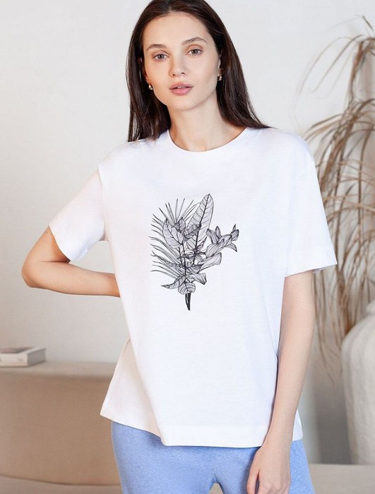 Футболка черного цвета изготовлена из премиального 100% хлопка, благодаря чему изделие приятно прилегает к телу, не вызывает дискомфорта и идеально подходит для чувствительной кожи. Натуральный материал сохраняет форму и цвет после множества стирок, обеспечивая долговечность изделия, а его высокая воздухопроницаемость создает ощущение свежести даже в течение долгого дня. Особое внимание привлекает стильный принт контрастного цвета в виде тропических растений. Принт выполнен красками с устойчивым покрытием, который добавляет изделию оригинальности и позволяет выразить индивидуальность. Свободный крой футболки дарит удобство и не стесняет движений, что делает ее идеальной для повседневной носки или активного отдыха, подчеркивает современный взгляд на моду. Подойдет девушкам и женщинам на любую фигуру, вы будете чувствовать себя в ней уверенно и комфортно. Лаконичный современный принт делает изделие универсальным: можно создавать стильные образы для прогулок, встреч, занятий спортом и домашних дел. Базовая футб