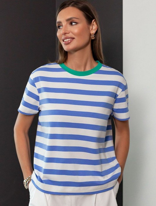 Базовая футболка в бело-васильковую полоску выполнена из премиального дышащего хлопка с добавлением эластана. Эта футболка идеально подходит для создания стильного образа. Классический вариант на лето или как нижний слой в прохладное время года.Футболка отлично держит форму и не теряет привлекательности даже после многочисленных стирок. Базовая полосатая футболка с ярким акцентом легко комбинируется с различными предметами гардероба и станет неотъемлемой частью вашего образа. Футболка из натурального хлопка идеально подойдет для создания стильных и молодежных образов. Модная футболка в полоску – это возможность выразить себя и подчеркнуть свою уникальность.