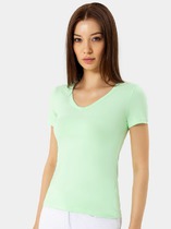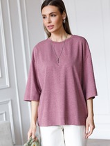 Футболка женская из гладкокрашенного трикотажного полотна «кулирка», свободного силуэта, с боковыми швами, переходящими в рельефы, в правом соединительном шве выполнен разрез. Горловина овальной формы обработана втачной планкой и дополнена декоративным элементом.