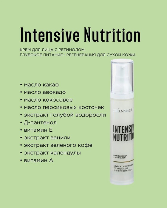 Aqua (вода), Theobroma Cacao Seed Butter (масло какао), Persea Gratissima (avocado) Oil (масло авокадо), Cocos Nucifera Oil (масло кокосовое), Sorbitan Olivate (оливем 1000 - эмульгатор и загуститель на основе производных жирных кислот оливкового масла), Peach Kernel Oil (масло персиковых косточек), Glycerin (глицерин), Lanablue (экстракт голубой водоросли), Д-пантенол (провитамин В5), Tocopherol (витамин Е), Ceramide (церамид), Vanilla Bourbon Extract (Vanilla Plantifolia Bean Extract) (экстракт ванили), Coffee Seed Extract (экстракт зеленого кофе), Calendula Officinalis (Calendula) Extract (экстракт календулы), Retinol (Vitamin A) (витамин А), Bisabolol (бисаболол), Perfume (парфюмерная композиция), Benzyl Alcohol, Benzoic Acid, Sorbic Acid, Glycerin (натуральный консервант Шаромикс 708 - бензиловый спирт, бензойная кислота, сорбиновая кислота, глицерин).