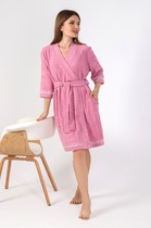 Халат женский выполнен из трикотажного полотна, 100% хлопок. Халат на молнии с двумя накладными карманами , горловина и низ халата обработаны широкой окантовкой, рукава и низ изделия оформлены вставками контрастного цвета, на карманах и полочке принт.