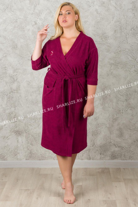 Красивый женский халат из трикотажной махры на запах.Прямой крой халата фиксируется поясом по линии талии, делая фигуру изящной и подчеркивая ее достоинства.Модель украшена минималистичной вышивкой с серебристой нитью.Вместительный пришивной карман добавляет модели практичности.