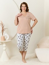 Халат женский из гладкокрашенного трикотажно полотна «кулирка» с набивным рисунком, полуприталенного силуэта, с короткими рукавами покроя «реглан» и горловиной овальной формы, окантованной основным материалом, с центральной бортовой застежкой на тесьму «молния». По срезу горловины выполнены неглубокие складки, нижние резы рукавов обработаны притачными манжетами с кантом контрастного цвета.