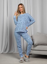 Халат женский из гладкокрашенного трикотажно полотна «кулирка» с набивным рисунком, полуприталенного силуэта, с короткими рукавами покроя «реглан» и горловиной овальной формы, окантованной основным материалом, с центральной бортовой застежкой на тесьму «молния». По срезу горловины выполнены неглубокие складки, нижние резы рукавов обработаны притачными манжетами с кантом контрастного цвета.