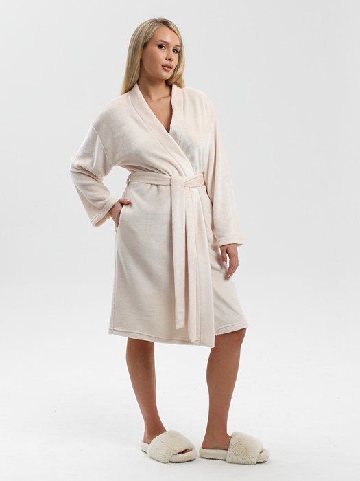 Халат молодежный из гладкокрашенного тканого полотна «велсофт», свободного покроя на «запахе», с длинными втачными рукавами, с притачной планкой по горловине и бортовым срезам, карманами в боковых швах, и декоративной нашивкой на спинке. Съемный завязывающийся пояс, продет в две шлевки в боковых швах на уровне талии.