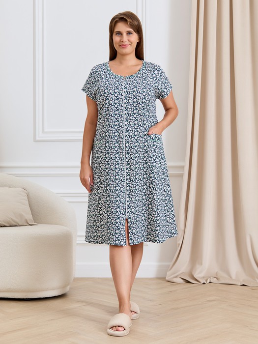Халат женский из трикотажного полотна «кулирка» с набивным рисунком, свободного покроя, расширенный к низу, короткими цельнокроеными рукавами, горловиной овальной формы, окантованной двойным кантом, центральной бортовой застежкой на тесьму «молния». Полочки с рельефными швами, карманами на уровне беде. Верхние срезы карманов обработаны притачными планками с кантом.