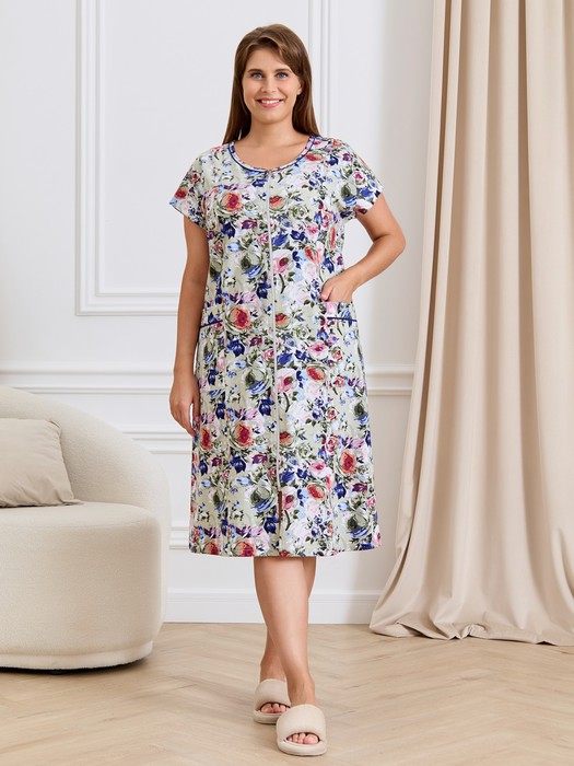 Халат женский из трикотажного полотна «кулирка» с набивным рисунком, свободного покроя, расширенный к низу, короткими цельнокроеными рукавами, горловиной овальной формы, окантованной двойным кантом, центральной бортовой застежкой на тесьму «молния». Полочки с рельефными швами, карманами на уровне беде. Верхние срезы карманов обработаны притачными планками с кантом.