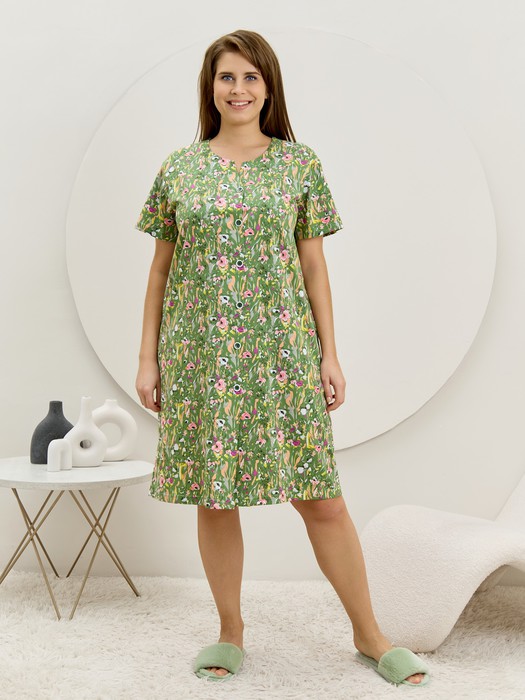 Халат женский из трикотажного полотна «кулирка» с набивным рисунком, прямого силуэта, с короткими втачными рукавами, карманами в боковых швах и центральной бортовой застежкой на обметанные петли и пуговицы. Горловина – овальной формы, переходящая в небольшой v-образный вырез выше верхней пуговицы. Входы в карманы и горловина спинки окантованы.