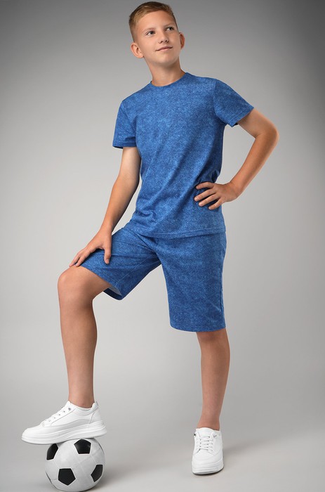 Детский костюм с эффектом Варёнка создан для ярких дней. В наборе футболка прямого кроя и удлинённые шорты. Синий костюм для мальчиков и подростков станет фаворитом на каждый день: будь то прогулка, лагерь или поездка с друзьями.