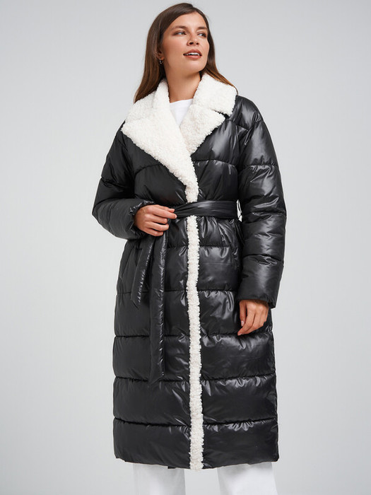 Двубортный пуховик прямого силуэта.